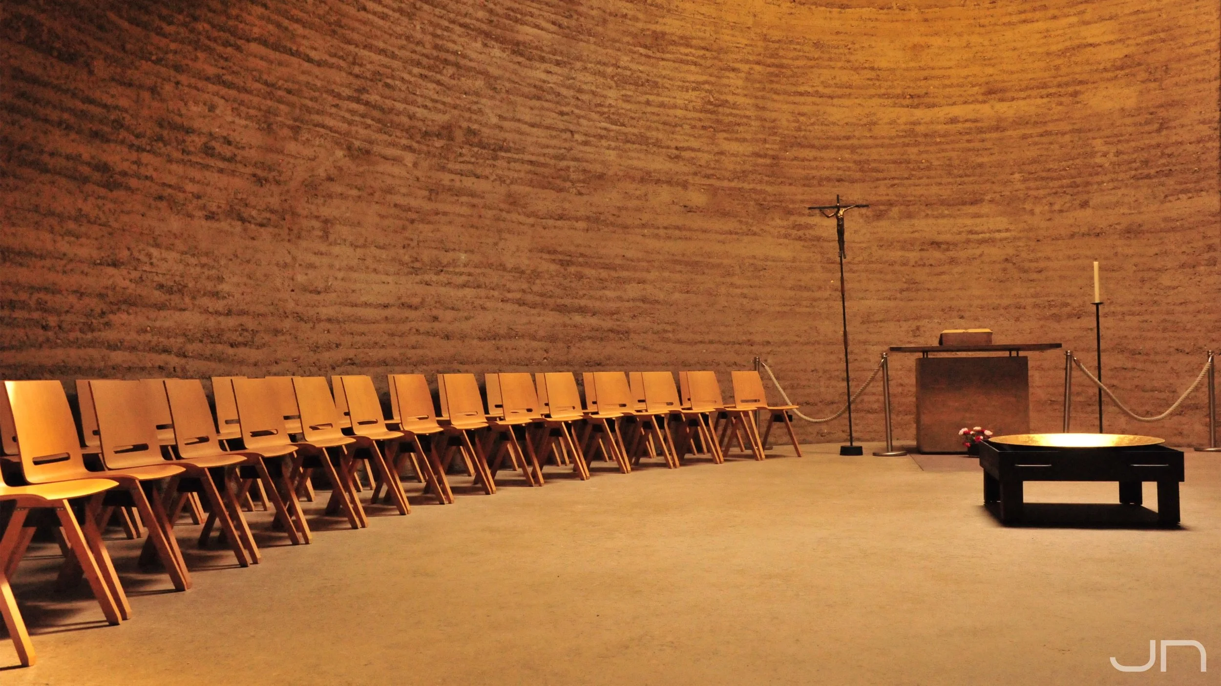 Clay is not a neutral material. It holds warmth, absorbs moisture, and reveals texture in a way that concrete or steel never can. Inside the chapel, the tactility of the walls changes the experience of space. Light is absorbed softly rather than reflected harshly. Sounds are muffled, giving the interior an almost hushed intimacy. The walls, layered by hand and pressure, display striations of earth that feel both fragile and timeless.